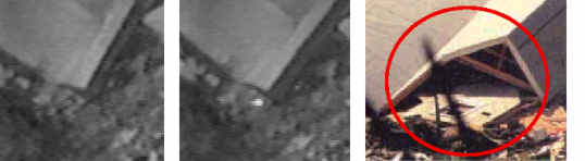 All the Waco flashes are clear examples of solar reflections (except for some that are thermal reflections of the fire [13] and others that reflect a tank's hot exhaust panel [16] ). One example: the first two images below are from the Waco FLIR. The second shows a flash that appears in a window at 12:08:31 pm. [17] The third image, a visible-light photo, shows the same window close-up, which is at the end of the collapsed gym catwalk. McNulty's videos claim that this flash is an FBI bomb exploding inside Mt Carmel seen through a window. Yet the third image shows that the window was flat on the ground. The next graphic from the Klasen- Madsen report [6] shows that at 12:08:31 the aircraft (red box) was in the exact position necessary to intersect a beam of reflected solar energy (red arrow) coming from a specular solar reflection on the fallen window, which the moving FLIR sensor would record as a flash.