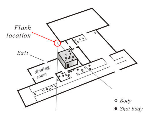 FORENSIC REALITY vs MYTH Michael McNulty's documentaries claim that flashes appearing on the Waco FLIR as the fire spreads are government agents shooting at Davidians as they tried to escape through the rear dinning-room exit. His first documentary states: "Most of the remaining Davidians were concentrated here in the kitchen dinning room area, it was their only way out except for one thing, two men outside were firing machine guns at them." The documentary calls this "the machine-gunning of the Davidians trapped in the burning kitchen dinning room." [1] McNulty's second documentary cites documentation apparently confirming that bodies were found near the dinning-room exit. The documentary states that machine guns were "being fired into the back of the dinning room" and that "according to the Justice Department report, at least fifteen people were found shot to death at this location." [2] Bullet-riddled bodies near the rear exit would seem to support McNulty's claim. However, consulting the cited documentation source, the Justice Department report, reveals that in reality zero bodies are listed as being found in the dinning room area. [10] The following illustration is based on a map in the Treasury Department report that shows the locations of recovered bodies in Mt Carmel. [11] The location where the series of flashes appear during the fire is circled. Most shot bodies were found in the concrete room shown below, which would shield those in it and in front of it from any gunshots coming from the flash location. The few shot bodies in a line of fire from the flash location were all shot in the head. [12] It's unlikely that a gunman firing blindly into a building would hit all his victims in the head. The easier explanation is that the shot bodies were suicides or shot by others inside Mt Carmel. The series of flashes that appear in the circled location above were caused by thermal reflections of the fire as it engulfed the floors above the concrete room. The flashes appear on a visible piece of debris attached to a fallen wall panel (the debris may be thermally reflective Mylar-film insulation). Gale-force winds cause the piece of debris to rapidly flap, which causes rapid flashing that produces an illusion of machine-gun fire. [13] The absence of bodies near the rear exit debunks two key propositions of the gunshot claim: (1) that Davidians were machine-gunned as they tried to escape the fire through the rear exit and (2) that the official report says fifteen shot bodies were found near the rear exit. PHYSICAL REALITY vs MYTH