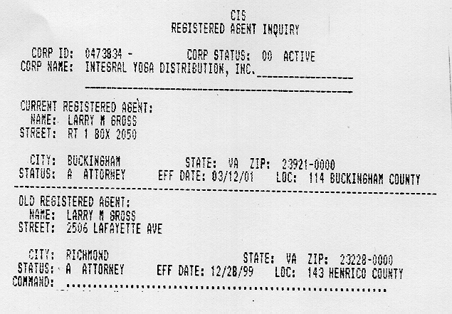 Integral Yoga Distribution, Inc. -- Larry Gross, registered agent
