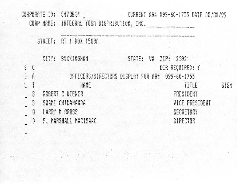 Integral Yoga Distribution Inc. -- Officers/Directors