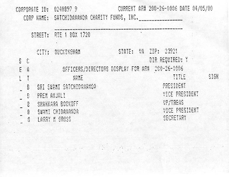 Note: Larry Gross claims that he disassociated himself from Yogaville after his controversial marriage to Catherine Cheng. However, since his supposed "letter of resignation" (dated April 1999) he clearly continues to hold official positions within Yogaville's enterprises according to official records.