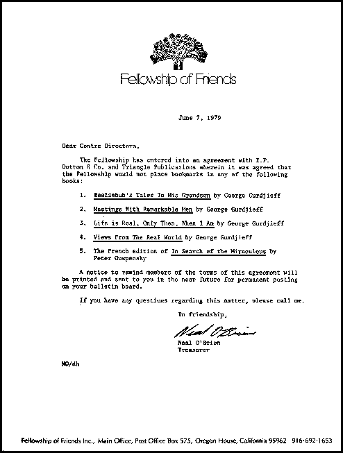 This letter is from Fellowship Of Friends (FOF) dated June 7, 1979 explaining that an agreement seems to exist between E. P. Dutton & Co. and Triangle Publications (copyright holders or publishers) and the group that (as listed) certain books are not to have bookmarks left in them by members of the FOF. A request that seems to have originated with the publishers and copyright holders.