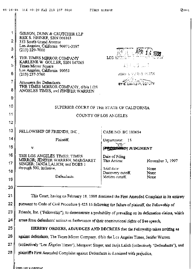 Judge's Order to Dismiss Lawsuit filed by Fellowship of Friends Page 1